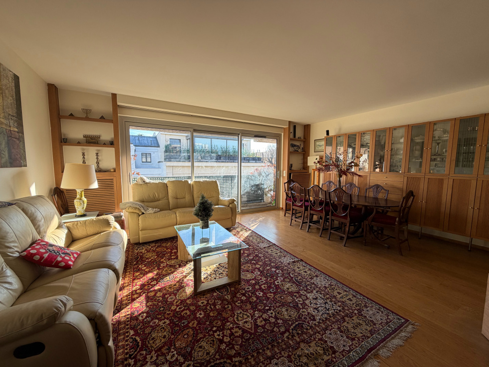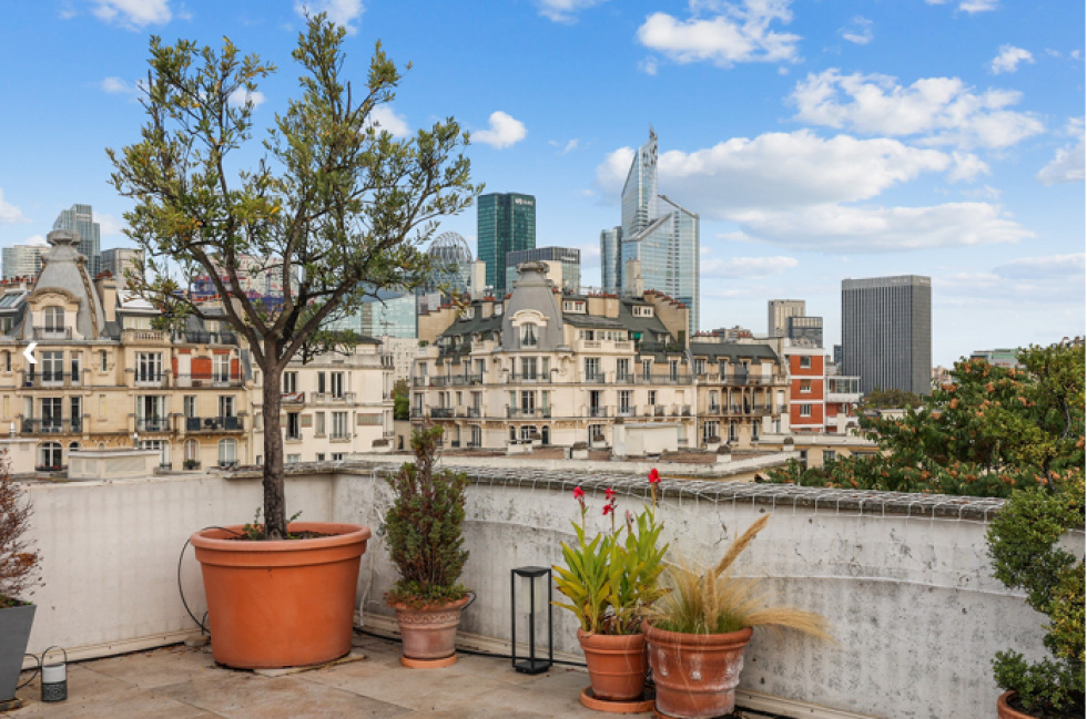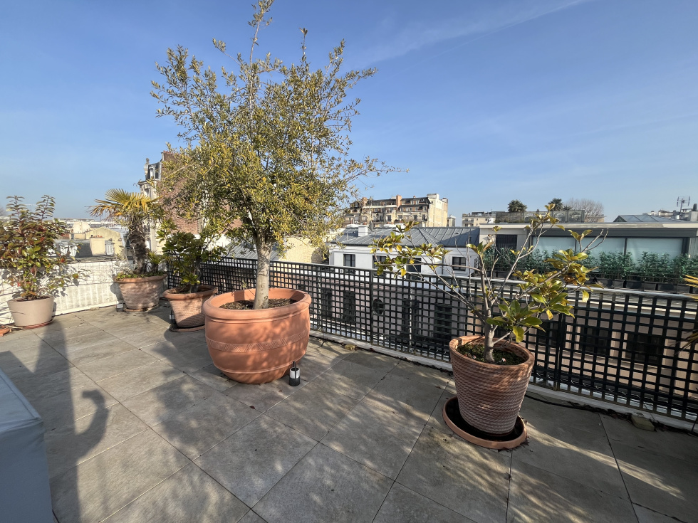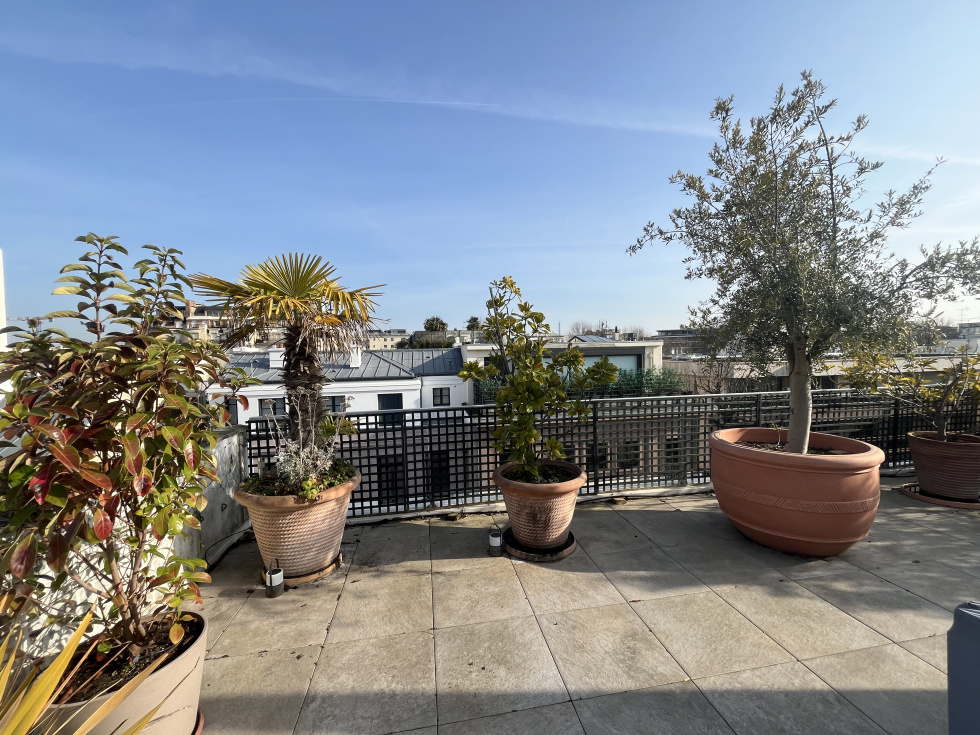 Neuilly St James Dernier étage terrrasse 118m2 +155 m2 de terrasse +15 m2 de balcons Magnifique appartement aménagé par un architecte de renom comprenant: entrée, séjour donnant sur un balcon escalier intérieur menant à une terrasse de 155m2 avec une panoramique sur la défense d'un côté et de l'autre vers la tour eiffel ( Possibilité d'amanénager une pièce de 34 m2 selon étude d'un architecte auprès de la mairie)., cuisine équipée, chambre parentale avec une salle de bains, wc et dressing, 2 autres chambres avec balcon sur jardin, salle de bains avec wc. 1 cave et 1 parking inclus ( 2ème parking en option) Excellent plan , bon état, belles prestations, triple exposition. L'étanchéité de la terrasse a été refaite en 2022. Le ravalement de l'immeuble sera réalisé en 2026